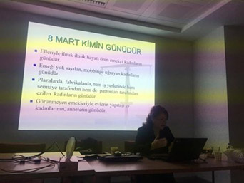 Başkanımız Av.Süreyya Turan tarafından, Hayat Holding çalışanlarına kadın hakları ve aile içi şiddet konulu eğitim verildi. 8 Mart Dünya Emekçi Kadınlar Günü sebebiyle ISMMMO tarafından düzenlenen söyleşide derneğimiz adına Başkanımız Av.Süreyya Turan tarafından kadın haklarının tarihi gelişimi ve kadın şiddeti konusunda bilgi verildi. Toplantı öncesinde Başkan Yücel Akdemir ve Hukuk Müşaviri Av.Zehra Yılmaz ziyaret edilerek bilgi alışverişinde bulunulmuştur.