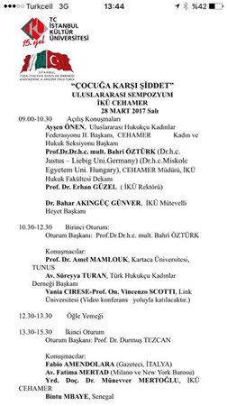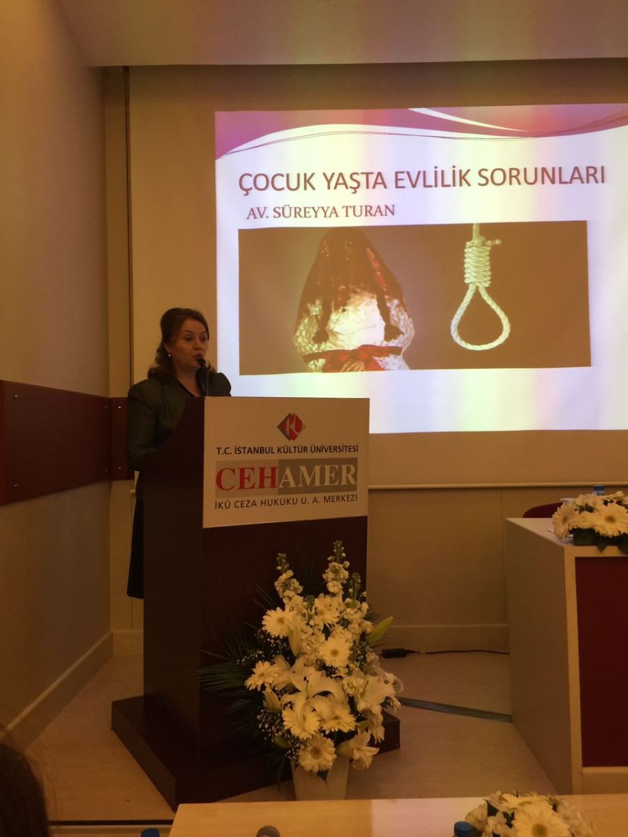 İstanbul Barosu Yönetim Kurulu Üyesi ve Türk Hukukçu Kadınlar Derneği Başkanı Avukat Süreyya Turan’ın “Erken Yaşta Evliliklerin Çocuklar Üzerinde Yaşattığı Fiziksel ve Psikolojik Şiddet” konulu sunumuyla katıldığı Sempozyumda yasal düzenlemelerin uygulamasında yaşanan sorunlar ve çözüm önerileri sunulmuştur. Sempozyumun diğer konuşmacıları; Prof. Dr. Amel MAMLOUK (Kartaca Üniversitesi, TUNUS), Vania CIRESE-Prof. On. Vincenzo SCOTTI (Link Üniversitesi), Fabio AMENDOLARA (Gazeteci, İTALYA), Av. Fatima MERTAD (Milano ve New York Barosu), Yrd. Doç. Dr. Münevver MERTOĞLU (İKÜ CEHAMER), Bintu MBAYE (Senegal), Av. Neomi LANDAU ( İsrail), Av. Liisa KIIANLINNA (Finlandiya), Dr. Nariman ABDELKADER (Mısır).